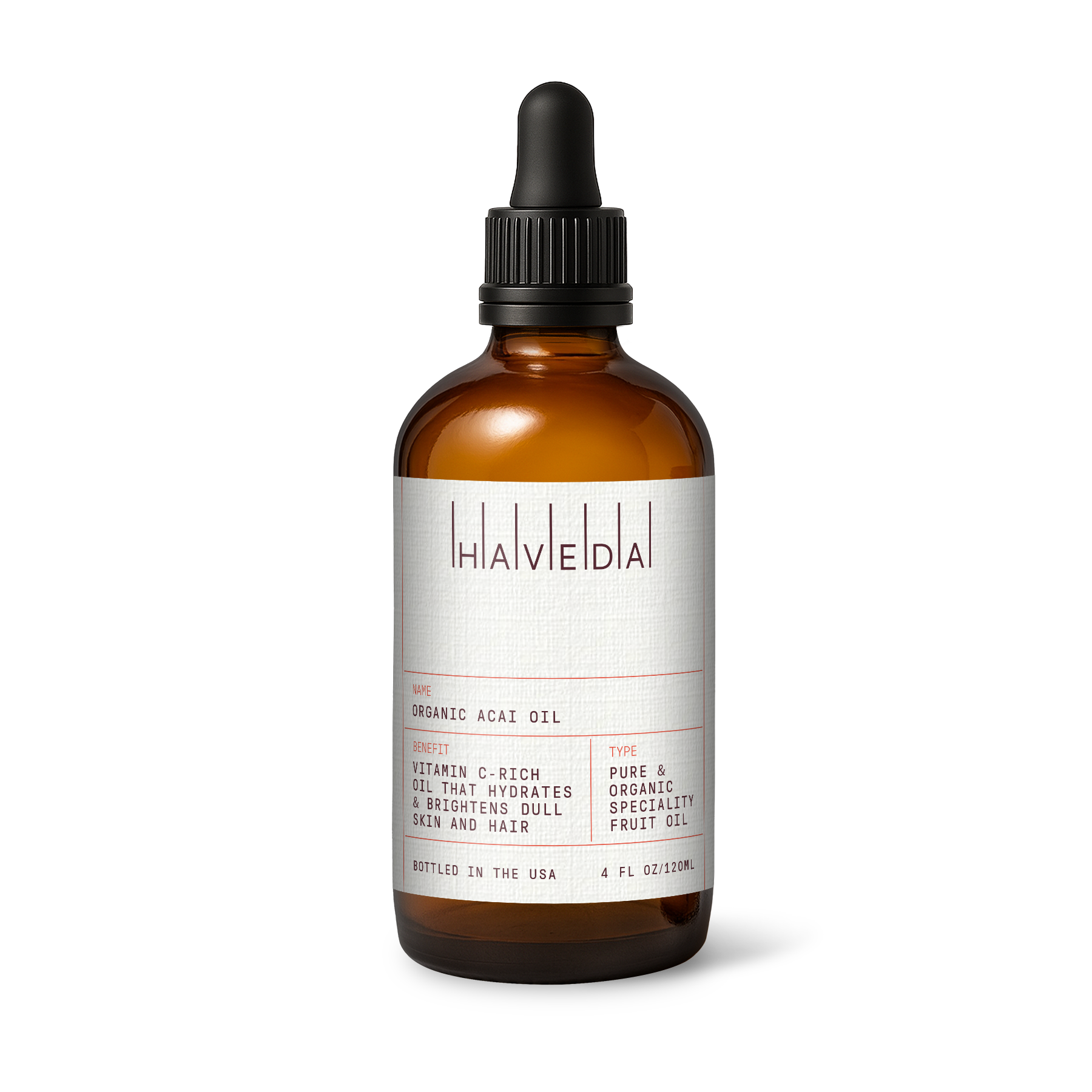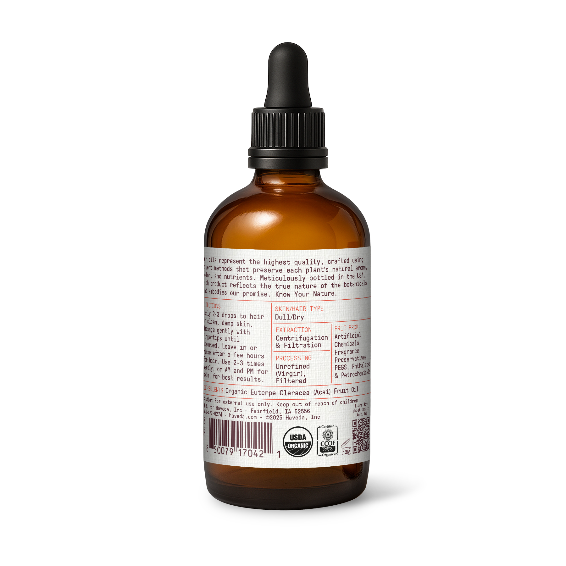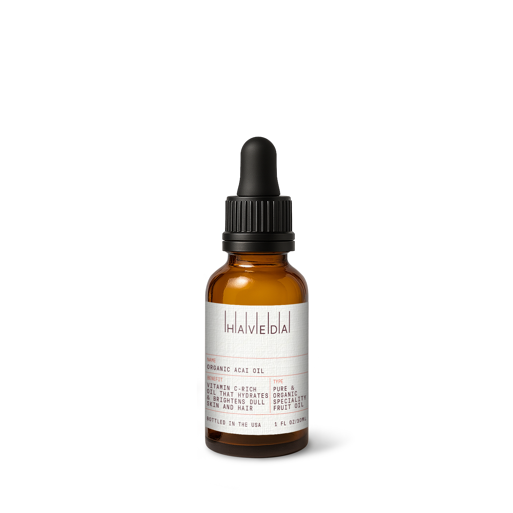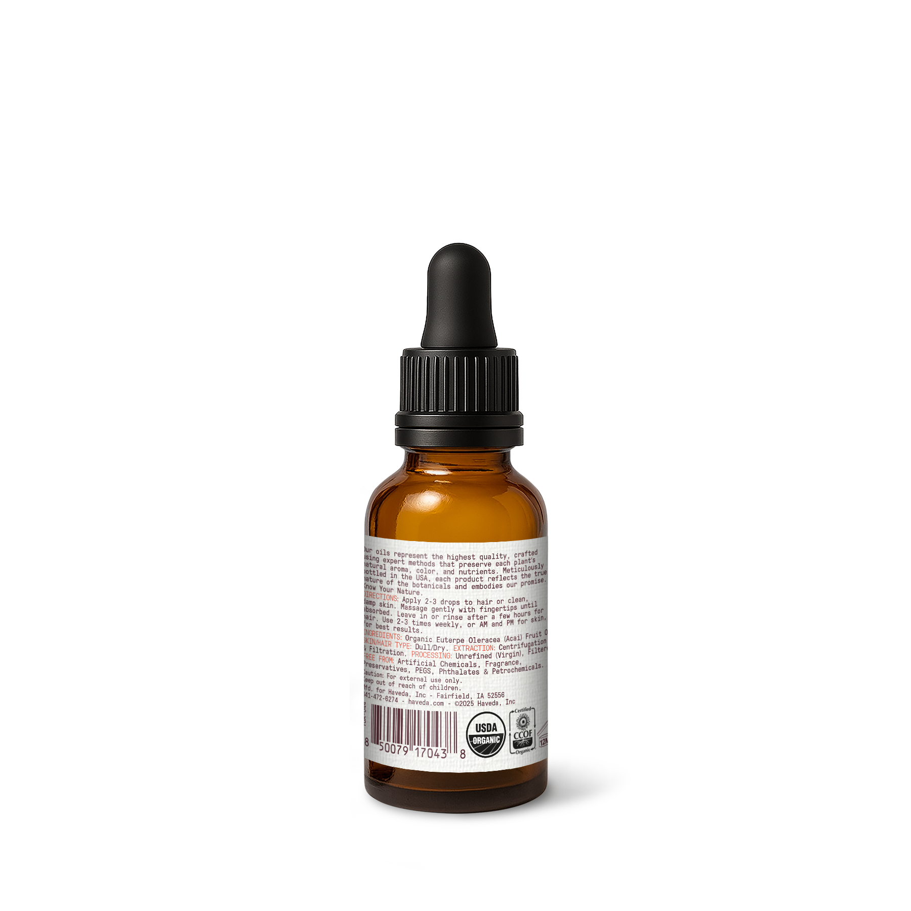 Organic açaí oil for hair & skin. Antioxidant-rich hydration that helps revive dullness with a light, dewy finish. Minimal, single-origin oil from Haveda.
