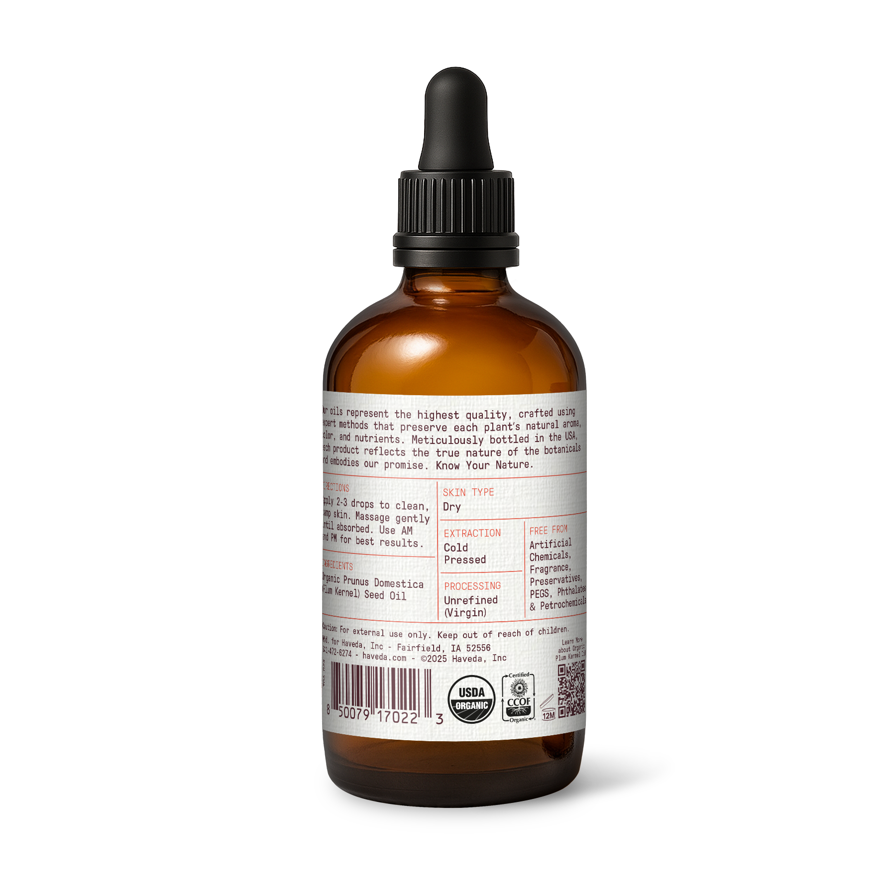 Cold-pressed from the kernels of French plums, organic plum kernel oil is full of vitamins A, C and E - as well as fatty acids. It has natural antioxidant properties, which make it an excellent oil for rejuvenation and radiance.