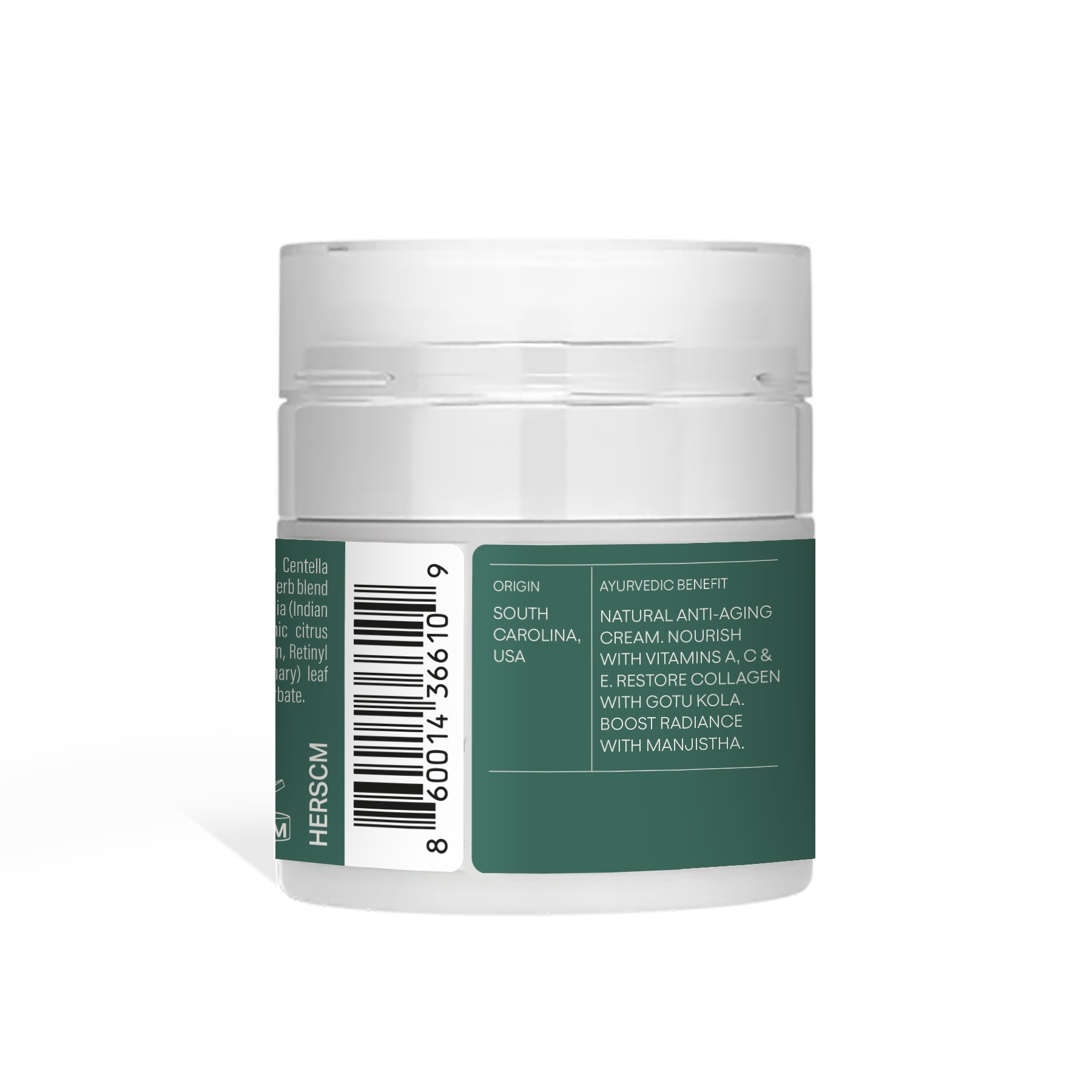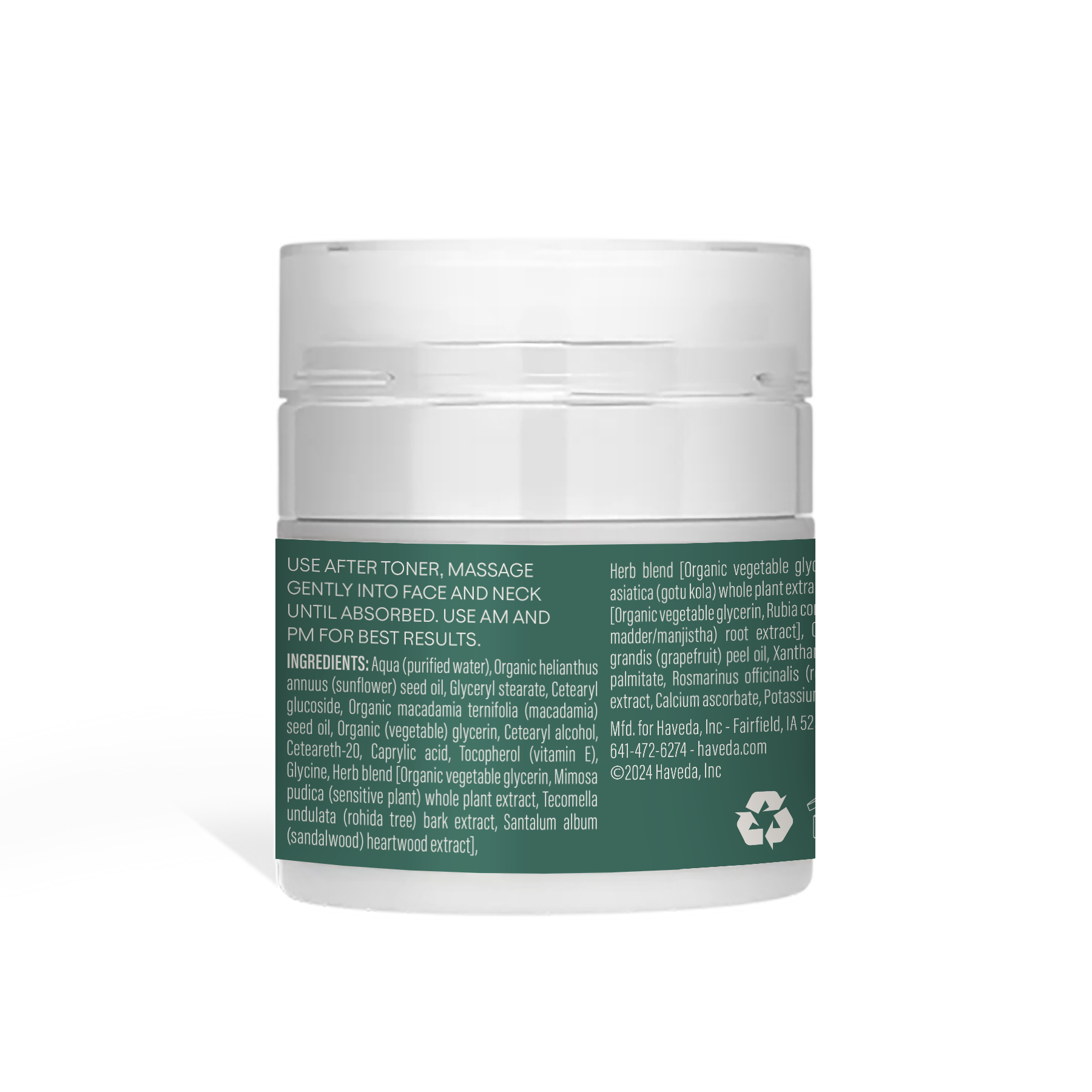 Aqua (purified water), Organic helianthus annuus (sunflower) seed oil, Glyceryl stearate, Cetearyl glucoside, Organic macadamia ternifolia (macadamia) seed oil, Organic (vegetable) glycerin, Cetearyl alcohol, Ceteareth-20, Caprylic acid, Tocopherol (vitamin E), Glycine, Herb blend [Organic vegetable glycerin, Mimosa pudica (sensitive plant) whole plant extract, Tecomella undulata (rohida tree) bark extract, Santalum album (sandalwood) heartwood extract], Herb blend [Organic vegetable glycerin, Centella asiatica (gotu kola) whole plant extract], Herb blend [Organic vegetable glycerin, Rubia cordifolia (Indian madder/manjistha) root extract], Organic citrus grandis (grapefruit) peel oil, Xanthan gum, Retinyl palmitate, Rosmarinus officinalis (rosemary) leaf extract, Calcium ascorbate, Potassium sorbate.